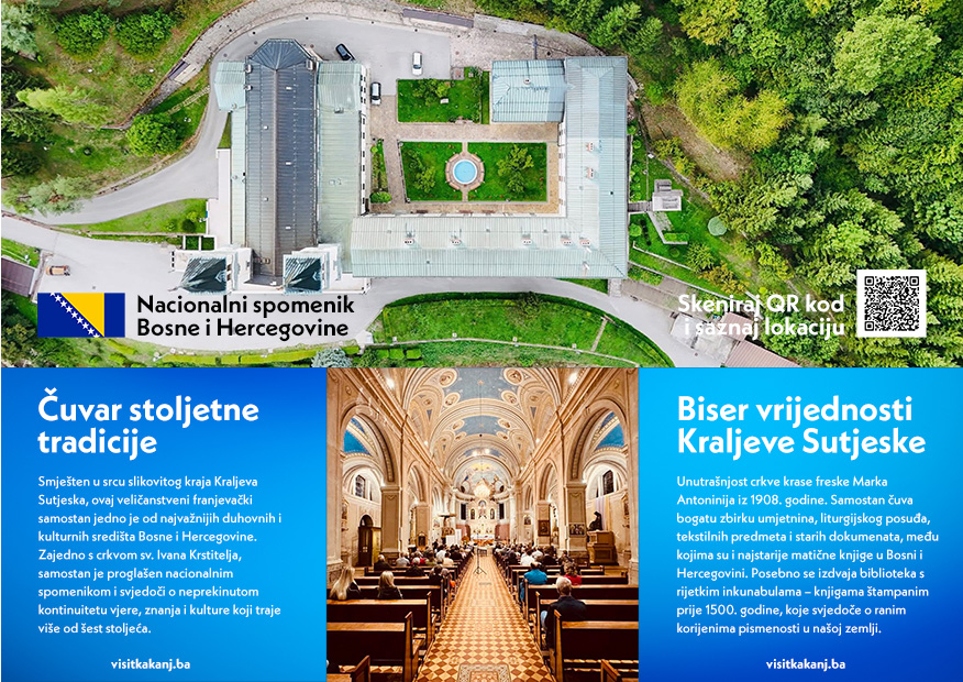 Smješten u slikovitom krajoliku Kraljeve Sutjeske, Franjevački samostan i crkva sv. Ive Krstitelja predstavljaju jedno od najvažnijih duhovnih i kulturno-historijskih središta srednje Bosne. Ova impozantna graditeljska cjelina, proglašena nacionalnim spomenikom Bosne i Hercegovine, već stoljećima odiše duhom vjere, znanja i očuvanja baštine.